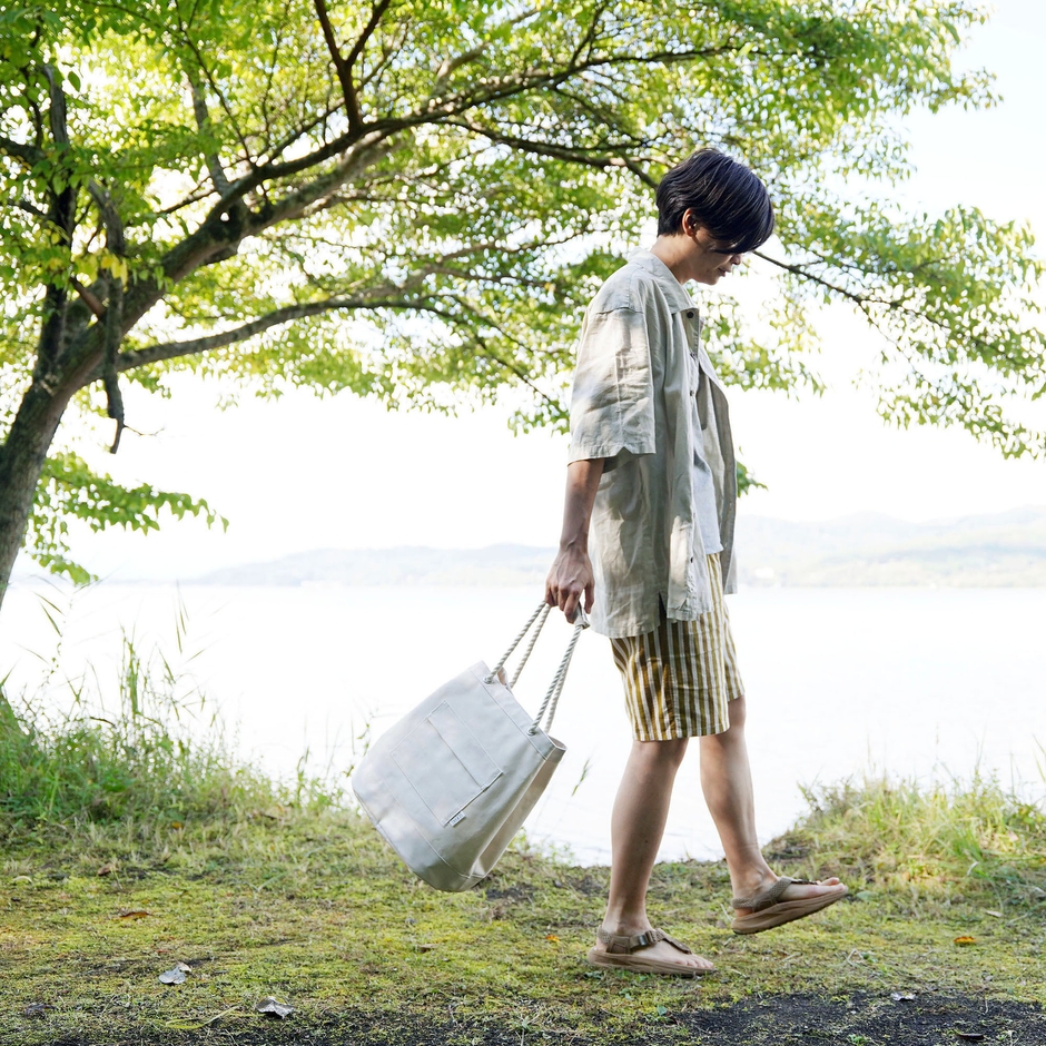 船乗りのダッフルバッグをデザインのベースにした、マリンテイストのトートバッグです。生地には、帆布の規格のなかで最も薄い11号帆布に、片面が塩化ビニールコーティングで防水加工されたものを採用しています。防水面をバッグの内側と底、取手部分に使用。重量は380gと、とても軽やか。タフさと軽やかさを兼ね備えた汎用性の高いバッグです。