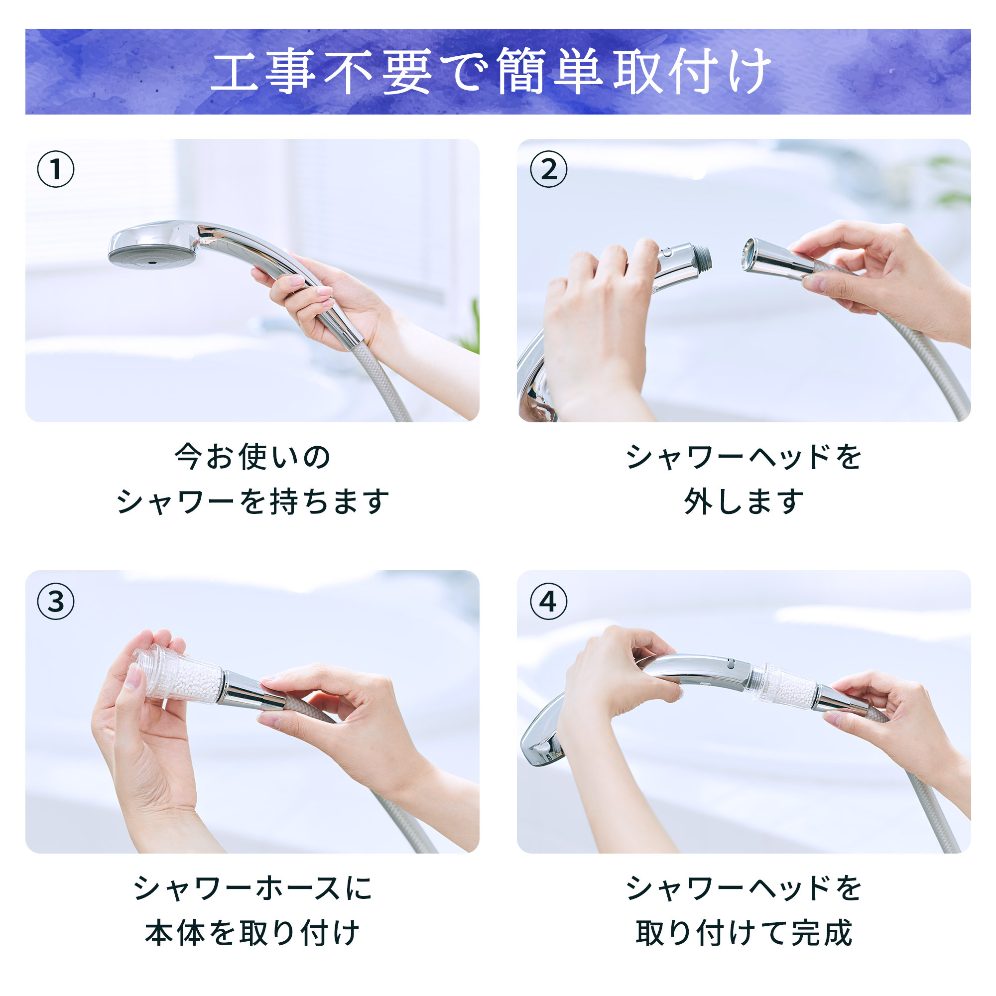 現在お使いのシャワーホースに取り付けるだけで使用でき、工事や専門知識は不要です。賃貸住宅でも安心して導入でき、引っ越し時の取り外しも簡単。特別な準備を必要とせず、思い立ったその日から使い始められる手軽さが、幅広い世代に支持される理由のひとつです。