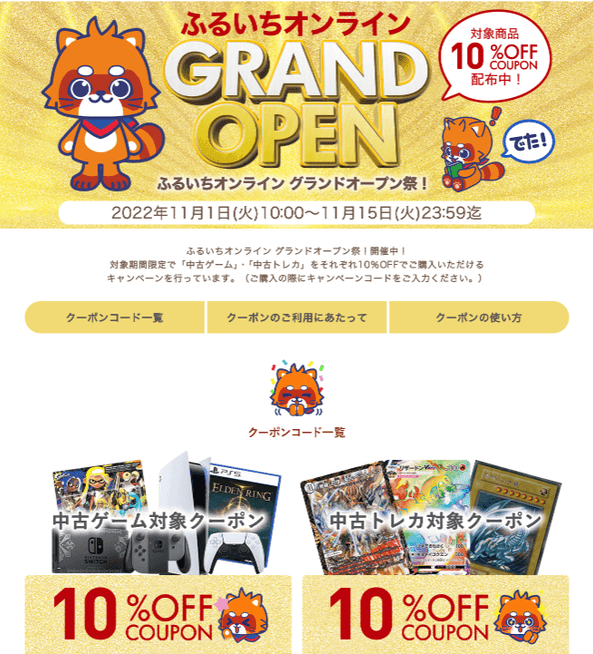 「リユースで地域と世界をつなぐ」をグループビジョンとして、全国に「古本市場」「ふるいち」「トレカパーク」などを展開する株式会社テイツー(本社:岡山県岡山市、代表取締役社長:藤原 克治、東証スタンダード:7610、 https://www.tay2.co.jp/ )は、2022年9月6日にリリースいたしました、自社公式ECサイトである「ふるいちオンライン」( https://furu1.online/ )において、グランドオープン記念セール第1弾として、2022年11月1日(火)10:00から11月15日(火)23:59までの期間、中古ゲーム、中古トレーディングカードが全品10%OFFとなる「ふるいちオンライン グランドオープン祭」を開催いたします。