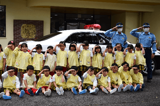 今年も飯塚警察署の警察官を招き、園児が理解しやすい絵カードなどを使ったクイズを通して、「道路の横断の仕方」「交通事故の原因となる危険な行動」「信号機の正しい見方と意味」など基本的な交通ルールについて学びます。また、練習用の横断歩道を用いて、安全な道路の横断の仕方を身につけます。また、交通安全教室の終わりには、街の安全を守るパトロールカーの見学も行います。本教室を通じて、園児が交通事故を未然に防ぎ、安全に行動できる力を身につけます。