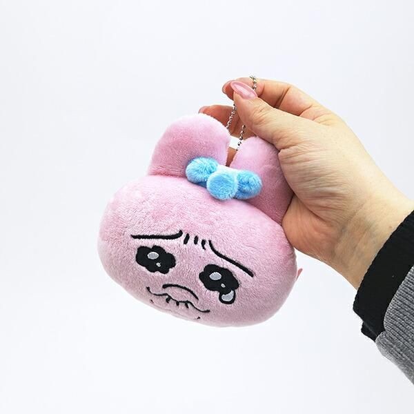 まずご紹介するのは、「おぱんちゅうさぎ ぬいぐるみミラーキーホルダー おかお」。サイズ:10cm×12cm×4cm。素材:ポリエステル、アクリル。ふわふわなぬいぐるみで、つい触りたくなる質感をしていますね!