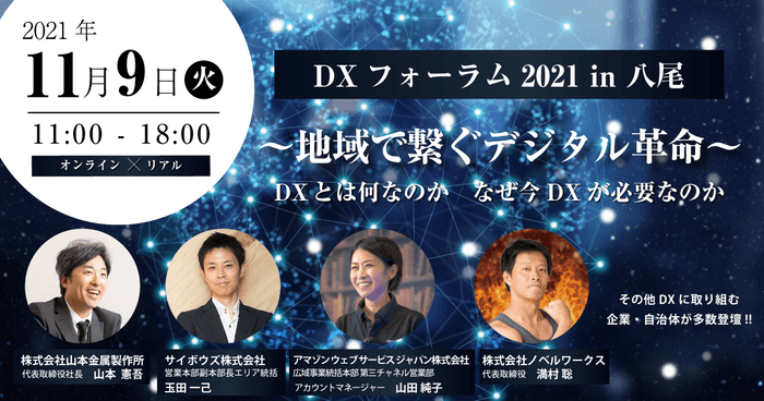 株式会社ノベルワークス(本社:大阪府大阪市西区、代表取締役:満村 聡、以下 ノベルワークス)は、株式会社みせるばやお(本社:大阪府八尾市、以下 みせるばやお)と共同で、中小企業や自治体が行うDXへの取り組み、トークセッションを通じて「気づき・学び・考える」事が出来る「DXフォーラム2021in八尾~地域で繋ぐ デジタル革命~」を2021年11月9日(火)に開催致します。