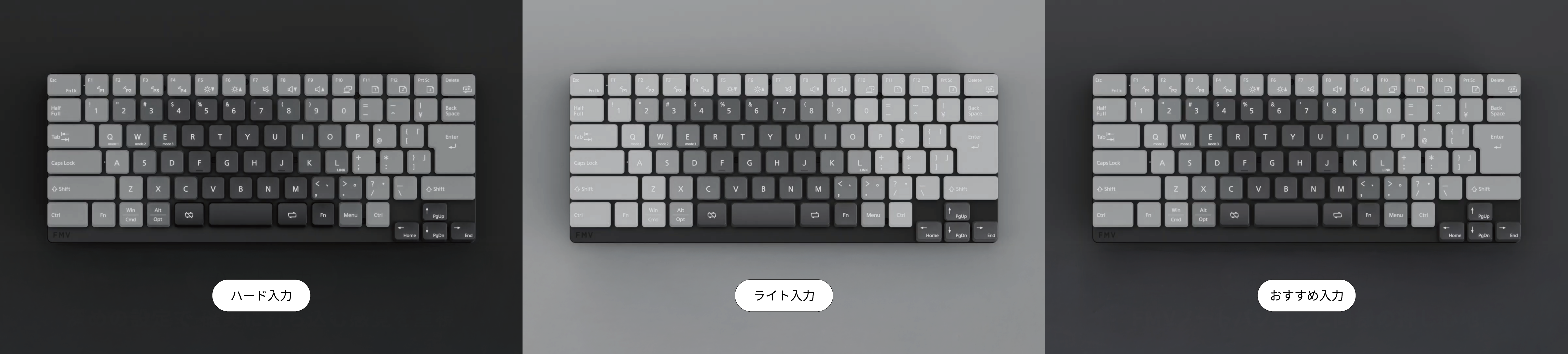 FMVキーボードマイスター監修の3種類のアクチュエーションプリセットを搭載しています。「ライト入力設定」では軽い力で素早く入力、「おすすめ入力設定」ではFMVノートパソコンと同様の押下圧、「ハード入力設定」では深く押し込んで確実に入力と、お好みの打鍵感をお選びいただけます。
