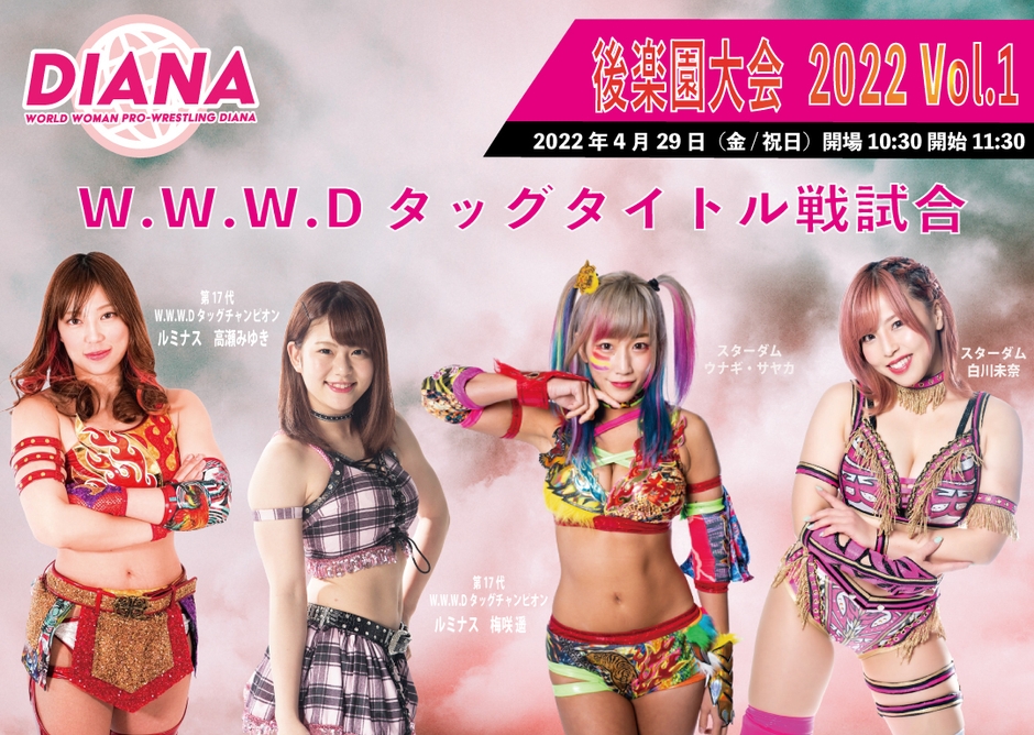 ワールド女子プロレス・ディアナ株式会社(代表:井上京子、所在地:神奈川県川崎市幸区中幸町3-16-1、URL: https://www-diana.com )は、後楽園大会(2022年4月29日(金・祝日)開場10:30 開始11:30)にてルミナス(梅咲遥&高瀬みゆき)が保有するW.W.W.Dタッグタイトル戦に、スターダム所属のウナギ・サヤカ&白川未奈の挑戦が決定いたしました。ウナギ・サヤカ&白川未奈両選手が外部団体のタイトル戦に参戦するのは初となります。ルミナスは第17代タッグチャンピオンになってから初の防衛戦となります。