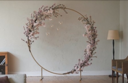 サークルスタンドにアシンメトリーで飾った枝ぶりの桜とハンギングガラス、本物の桜の枝からは、華やかなガーランドが。シックなフロアに映える、趣の異なる2種のフォトスポットはこの時期だけ。日本の春を表現した桜のアレンジメントをお楽しみください。