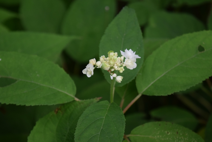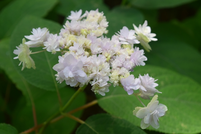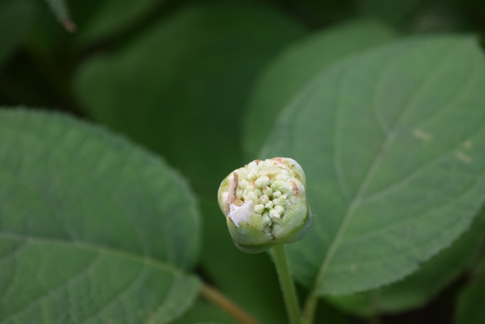 開花はほかの系統より遅咲きで、ほかのアジサイが咲いている頃に、大きく玉のようなつぼみを見ることができます。その玉のようなつぼみがほころび、開花し、見ごろとなりました。休憩所兼売店の裏手に咲いています。