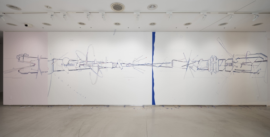 1981年北海道生まれの盛は、現在パリを拠点としてBug report(線の起源を糸とする仮説から、これまで糸によるドローイングシリーズ)を展開してきました。盛が『衣を家に例えると、糸は建材を司る』と言うように、糸のドローイングには建築設計図のように緻密で幾何学的な形状が現われます。