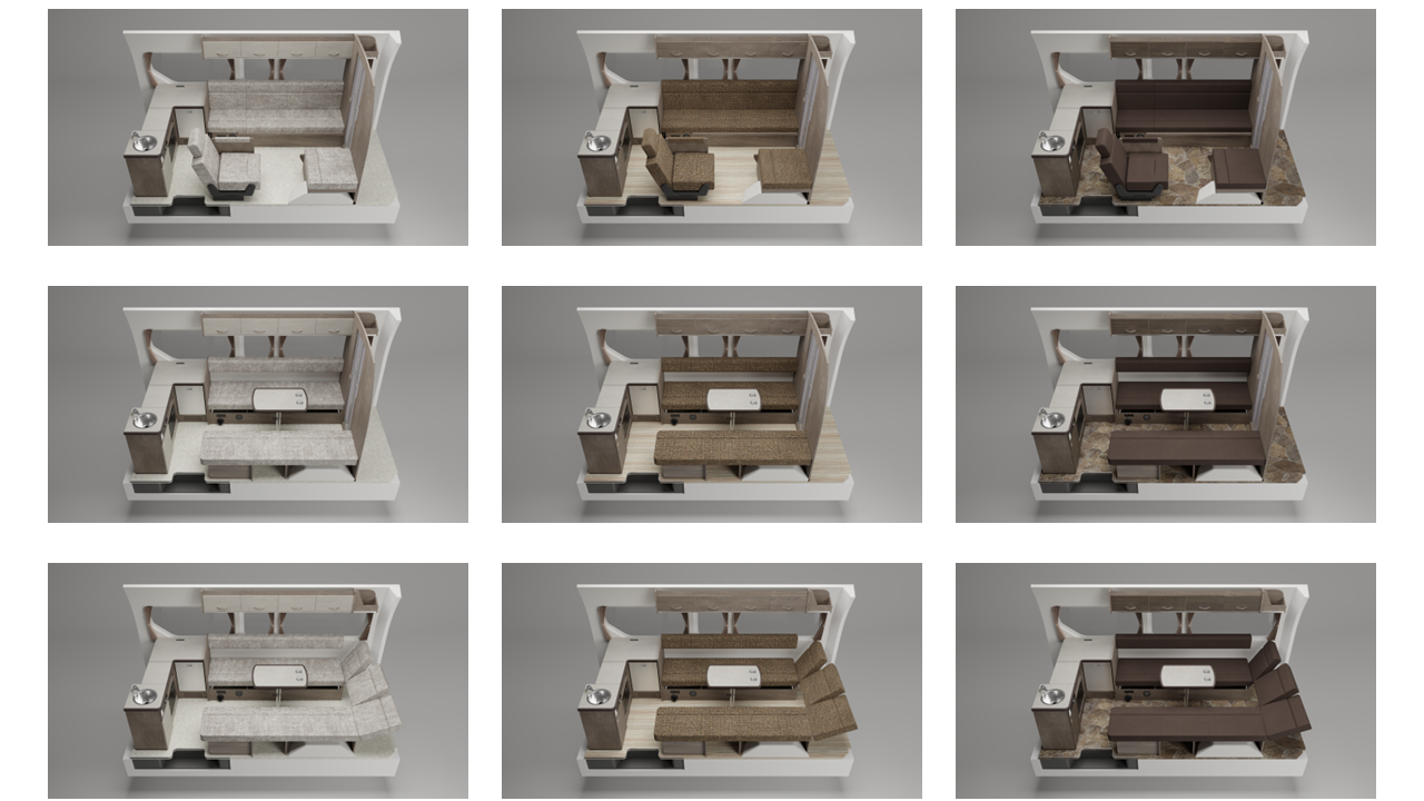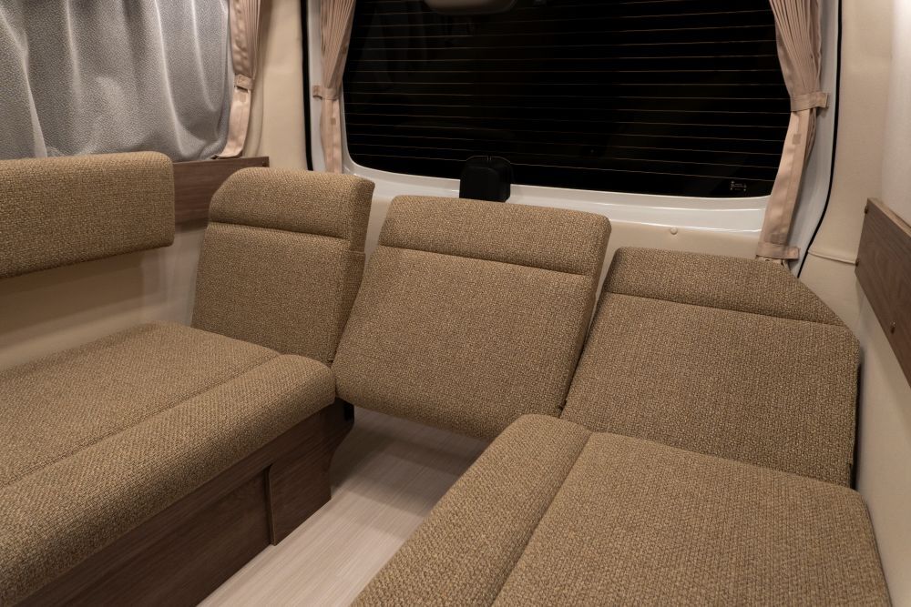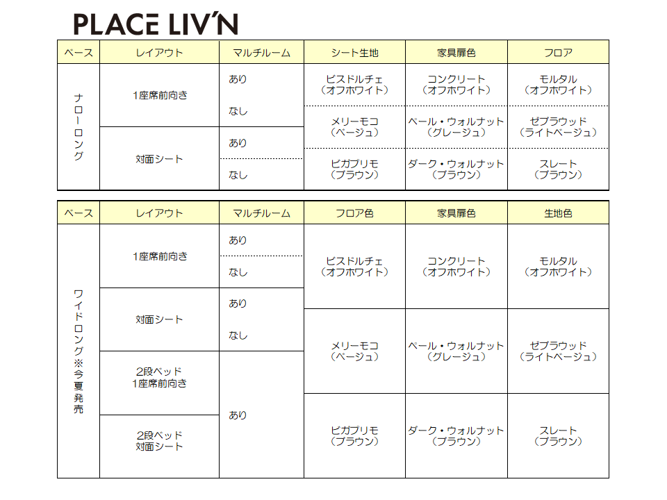 ・圧倒的なカスタマイズ性:レイアウト(マルチルーム有無、シート形状)、内装色(床、家具、生地)を組み合わせ、最大270通りのパターンから自分好みの一台を選択可能です。