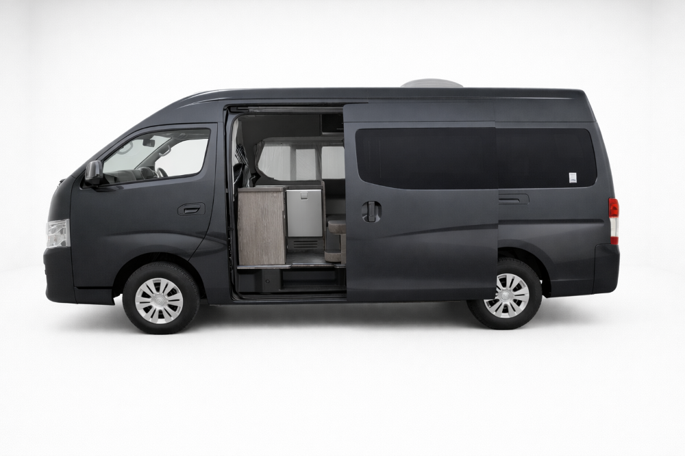 ・日産キャラバン「ナロー・ロング×ハイルーフ」の採用:街中での取り回しが容易な車体サイズでありながら、車内で大人が立って過ごせる居住性を確保しています。※ワイド版は、今夏発売