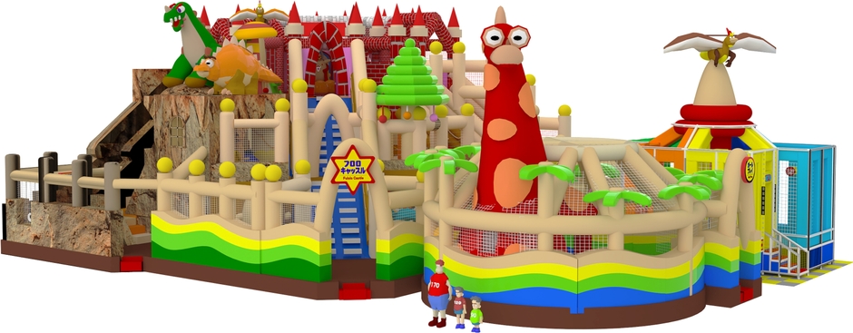 お城をイメージした大型のエア遊具には、高低差4m以上の巨大スライダーや恐竜さんのいるボールプールなど、楽しい要素が盛りだくさんです。