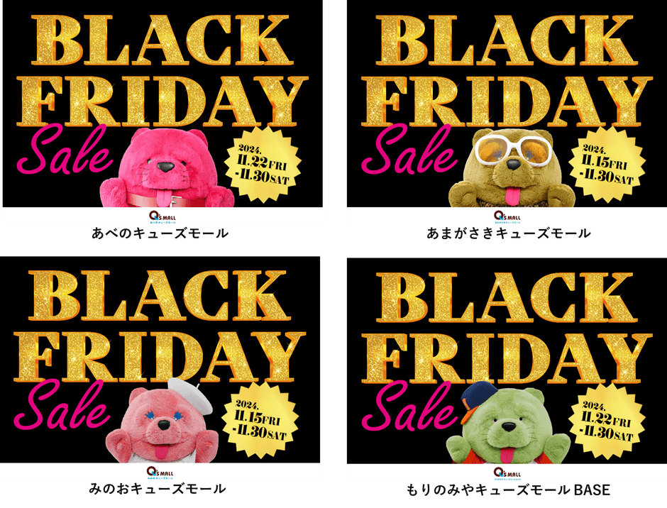 「キューズモール」4施設(あべのキューズモール・あまがさきキューズモール・みのおキューズモール・もりのみやキューズモールBASE)の各施設では、2024年11月中旬より順次、お得にお買い物をお楽しみいただける「BLACK FRIDAY SALE(ブラックフライデーセール)」を実施します。