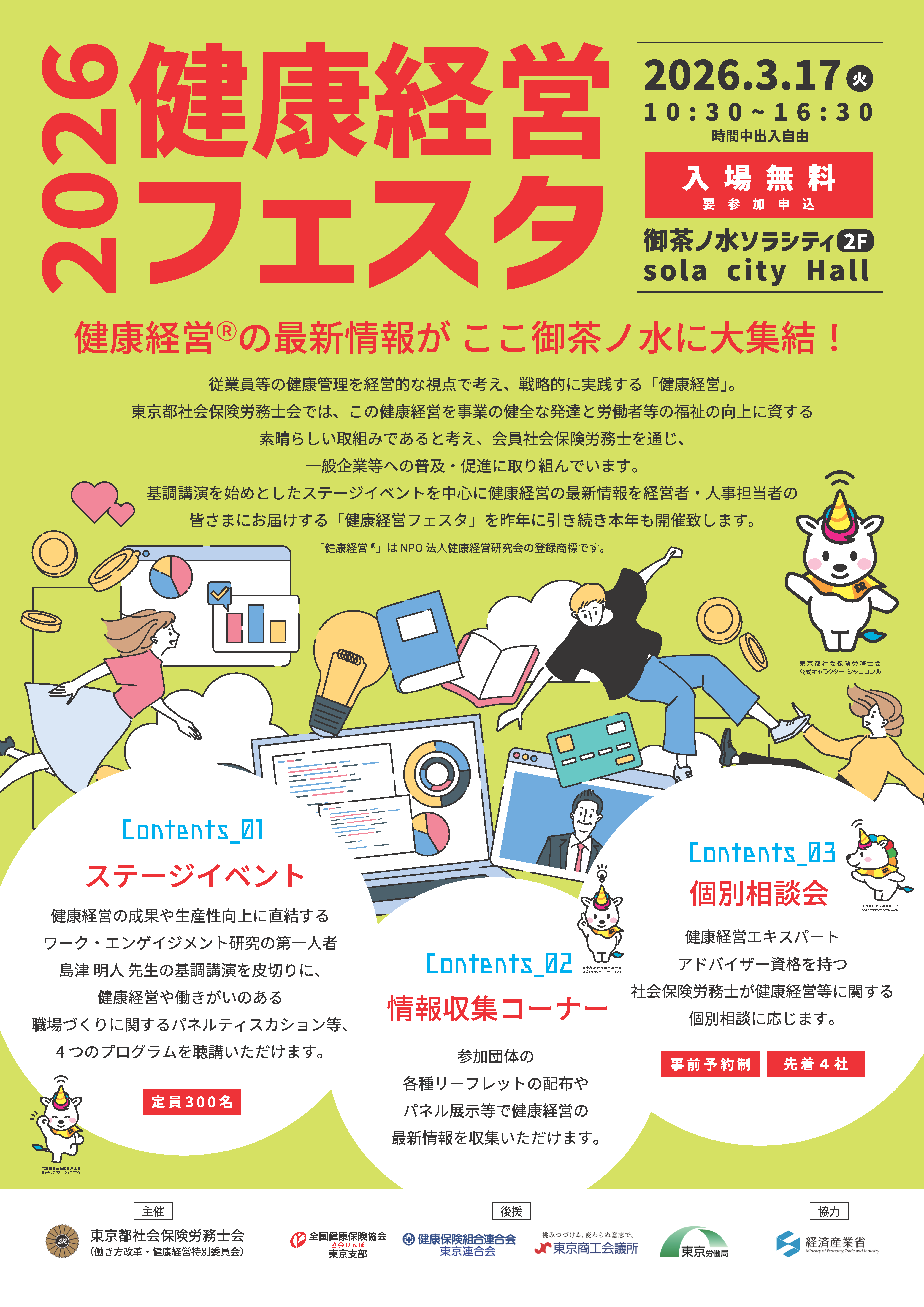 東京都社会保険労務士会(会長 味園 公一)は、従業員等の健康管理を経営的な視点で考え、戦略的に実践する「健康経営」を、事業の健全な発達と労働者等の福祉の向上に資する取り組みであると考え、社労士を通じ一般企業等への普及・促進に取り組んでいます。