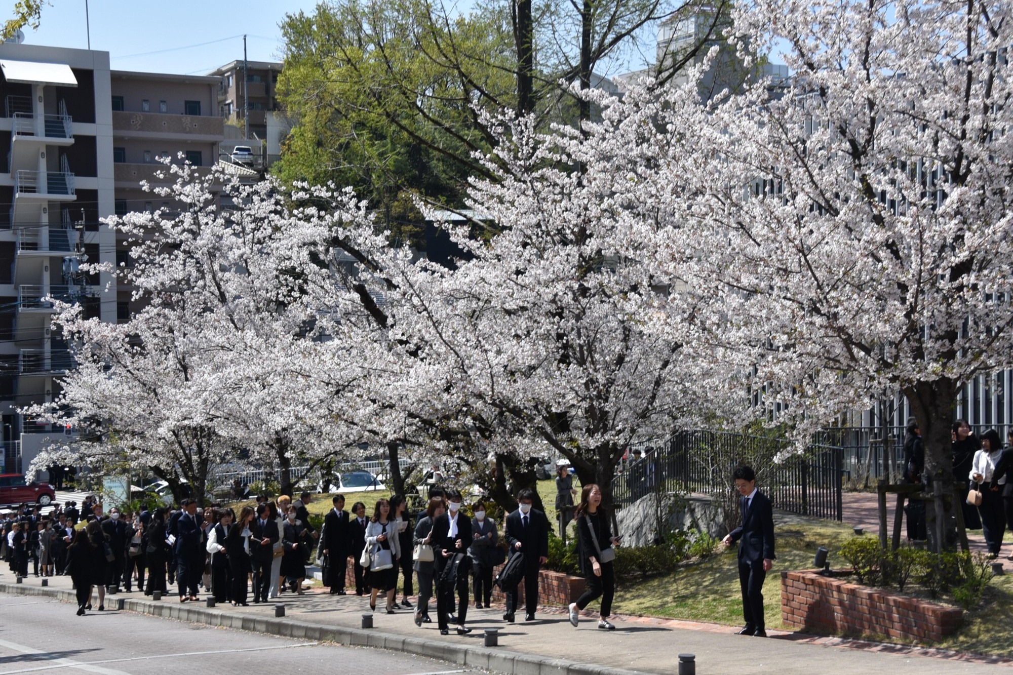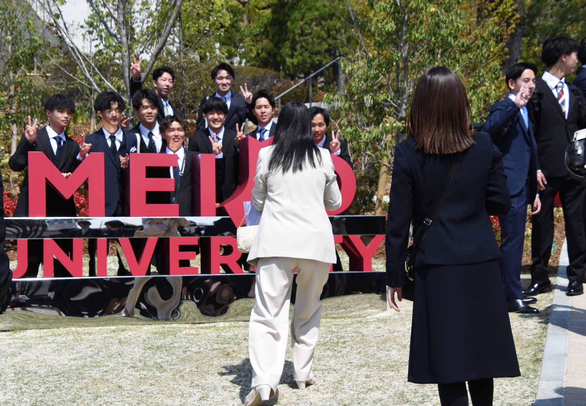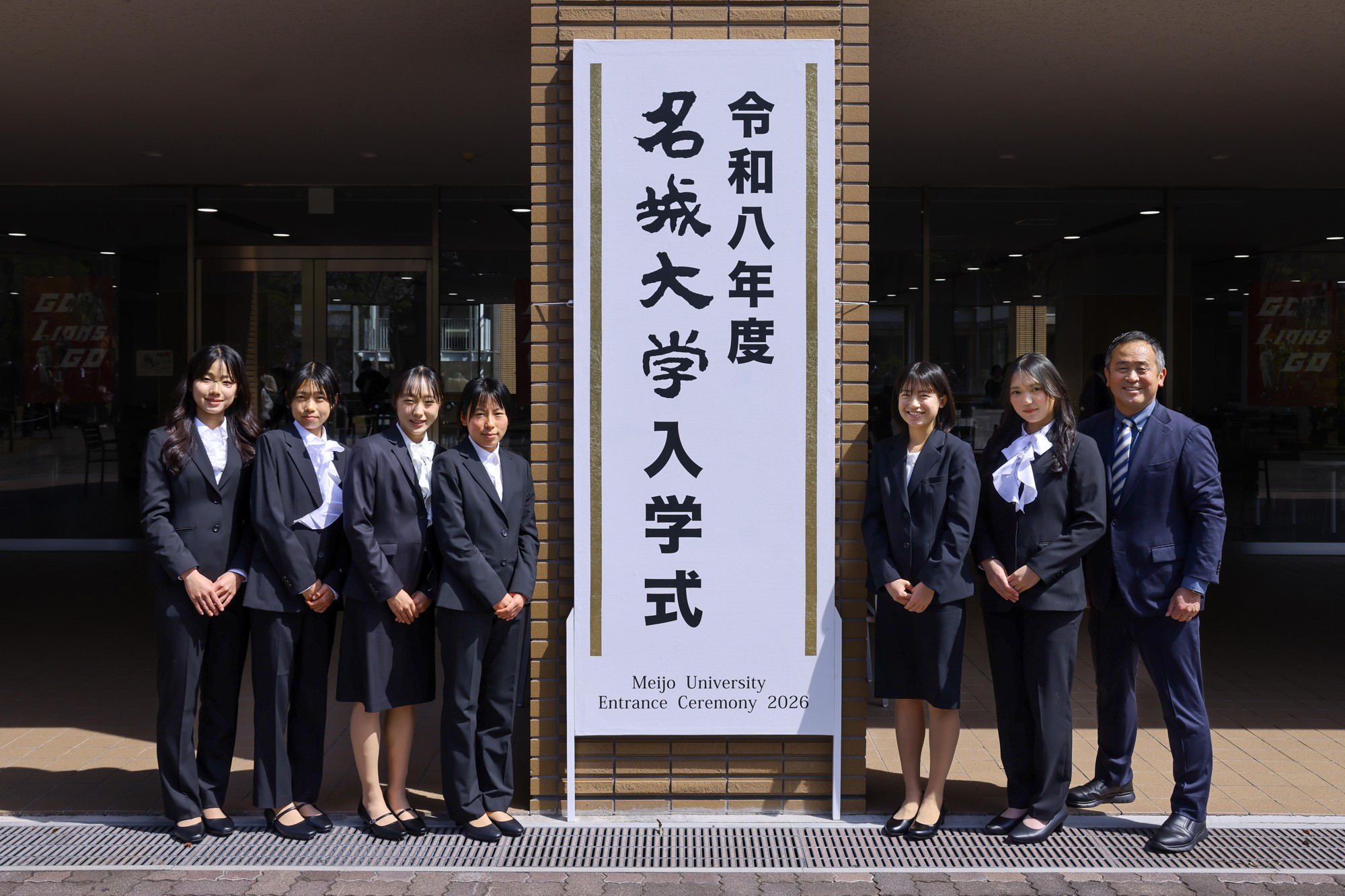 この日は好天に恵まれ、正門から続く坂道の桜並木で満開の桜の花とLIONS ARENAをバックに新入生と保護者らが記念撮影する姿があちこちで見られ、共通講義棟北と共通講義棟南の周辺に設けられたフォトスポットでも、式の終了後に保護者や友人らと記念撮影をする新入生でにぎわいを見せていました。