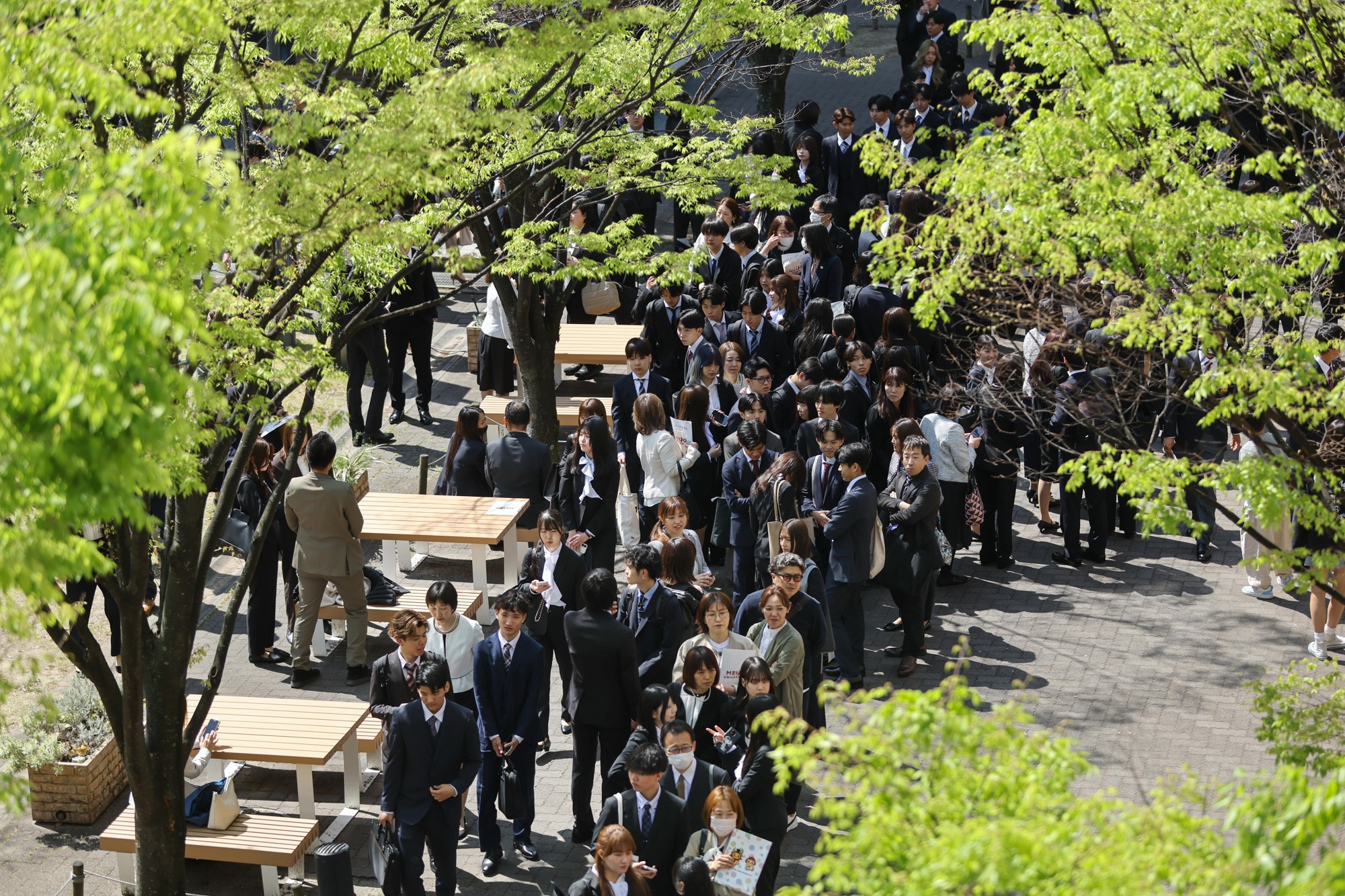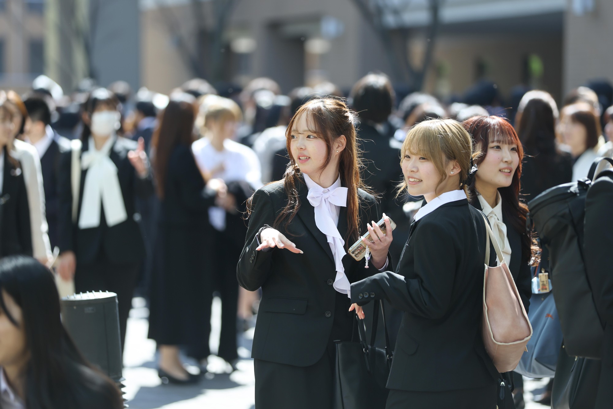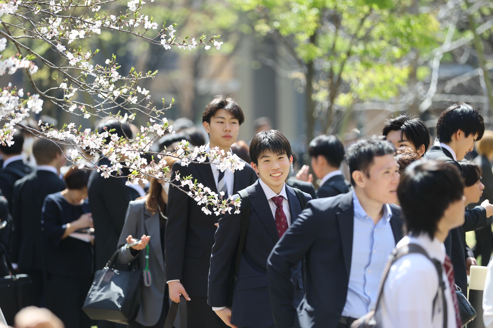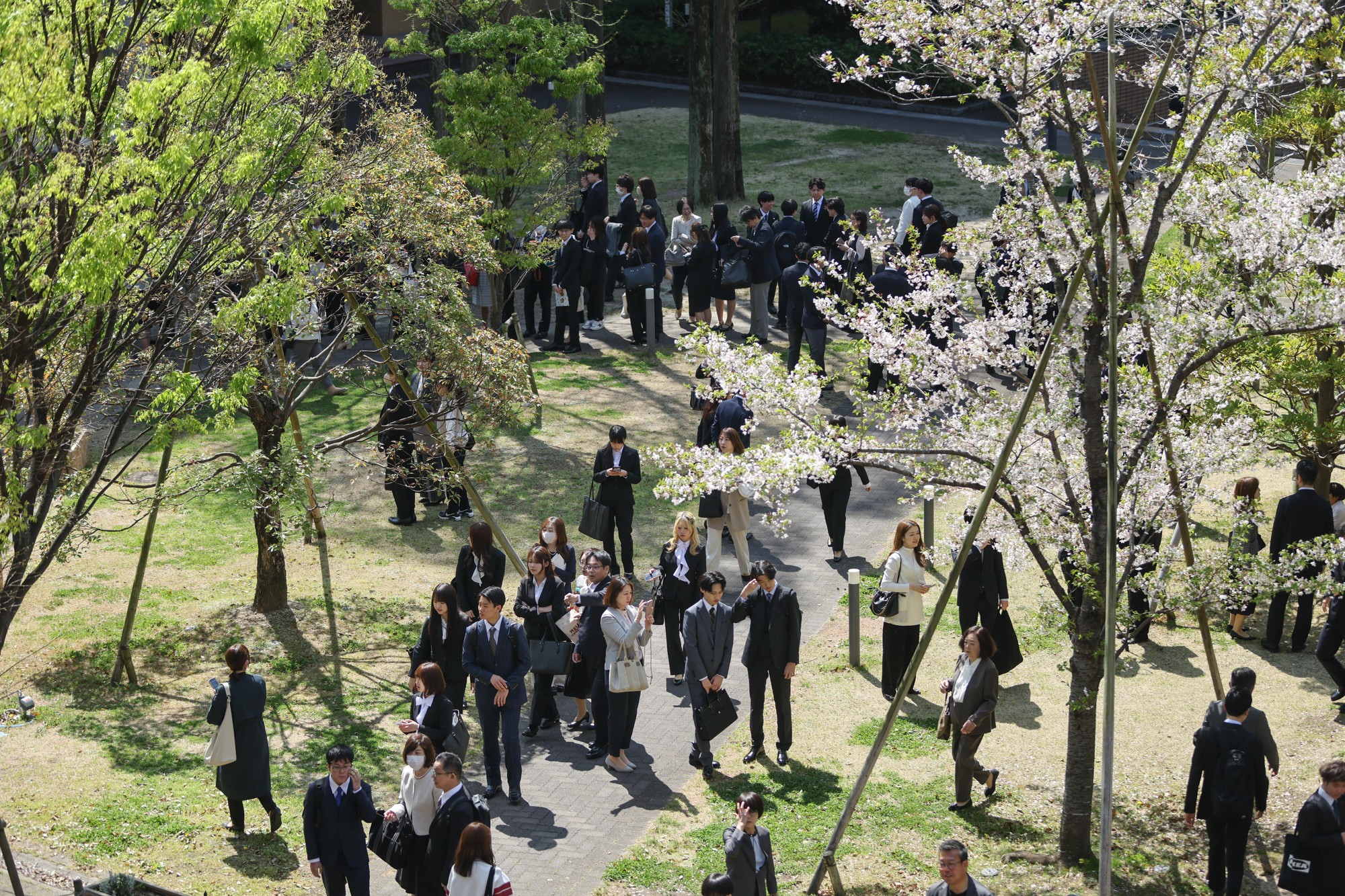 この日は好天に恵まれ、正門から続く坂道の桜並木で満開の桜の花とLIONS ARENAをバックに新入生と保護者らが記念撮影する姿があちこちで見られ、共通講義棟北と共通講義棟南の周辺に設けられたフォトスポットでも、式の終了後に保護者や友人らと記念撮影をする新入生でにぎわいを見せていました。