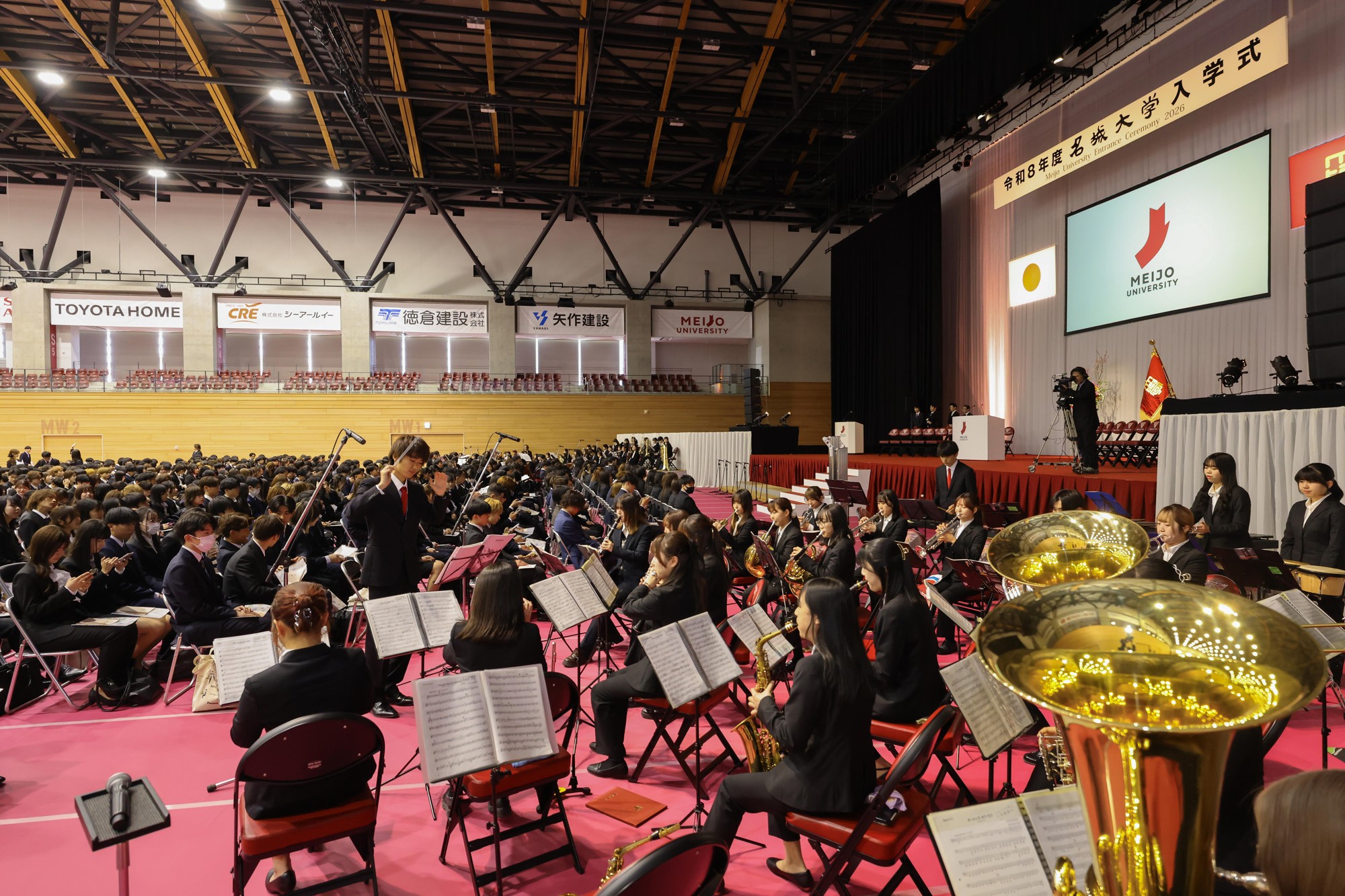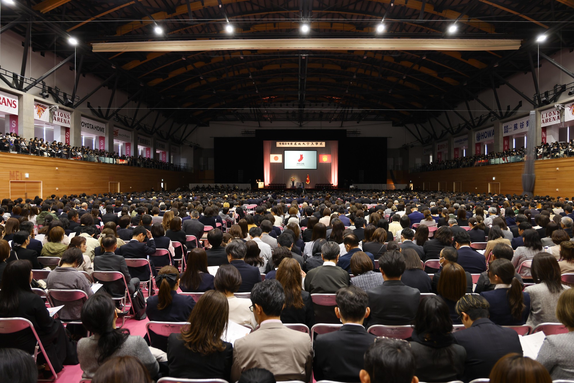 令和8年度の入学式が4月3日、天白キャンパスの「名城大学開学100周年記念アリーナ」(LIONS ARENA)で初めて挙行されました。式典は2部制で行われ、1部は法・経営・経済・薬・都市情報・人間・外国語・総合学術の学部・研究科、2部は理工・農・情報工の学部・研究科の新入生が出席し、学部3558人(編入学を含む)、大学院397人、合わせて3955人が新しいアリーナから新たな学生生活の第一歩を踏み出しました。