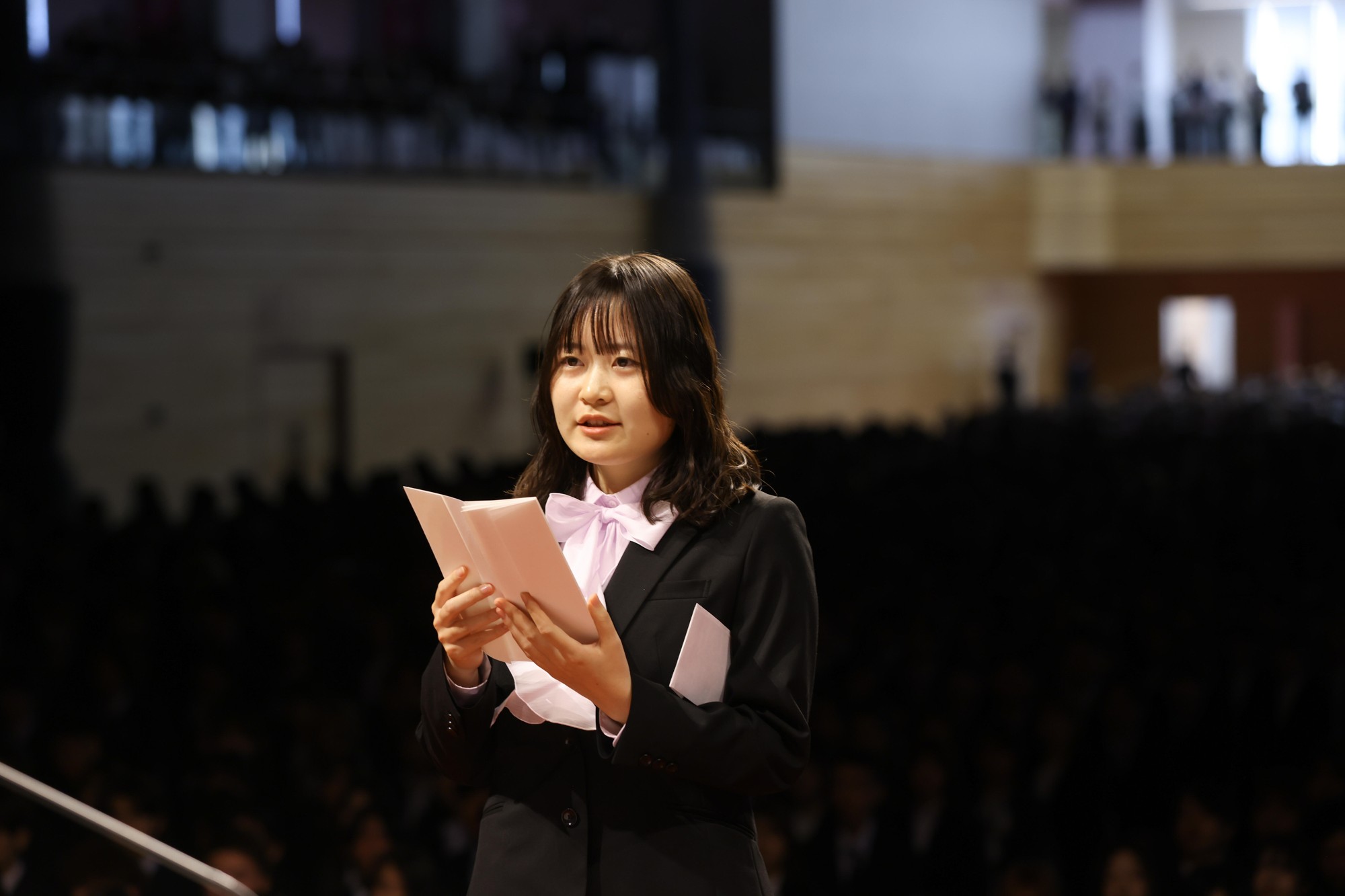 新入生宣誓は、1部は羽飼陽香さん(都市情報学部)が学部を、福西悠鯉さん(総合学術研究科)が大学院を代表して登壇。羽飼さんは「人々の暮らしをより豊かにする社会の実現に貢献できる人材となることを目標とし、大学生活で実りのある4年間にしていきたいと思います」と誓い、福西さんは「知の探究に励み、互いに高め合いながら、疑いながら進み、信じながら戻ることで、新たな時代の先駆者となるべく研鑽を積むことを誓います」と決意を述べました。