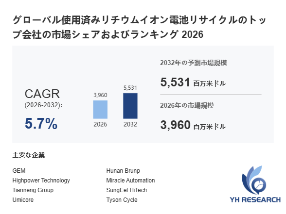 YHResearch調査チームの最新レポート「グローバル使用済みリチウムイオン電池リサイクルのトップ会社の市場シェアおよびランキング 2026」によると、2026年の3960百万米ドルから2032年には5531百万米ドルに成長し、2026年から2032年の間にCAGRは5.7%になると予測されています。