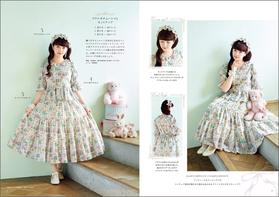 できるだけ作りやすくて、オールシーズン楽しめる、日常的に着やすいシルエットにこだわったという青木美沙子さん。全体的に着丈を長めにし、袖もひじが隠れる上品な袖丈や長袖、スカートのシルエットはパニエがあってもなしでも楽しめるデザインに。小物は可愛らしさだけでなく使い勝手の良さや収納力も◎。また、使用する布地やレース、リボンなどもデザインイメージや雰囲気に合うものをチョイスしていただきました。