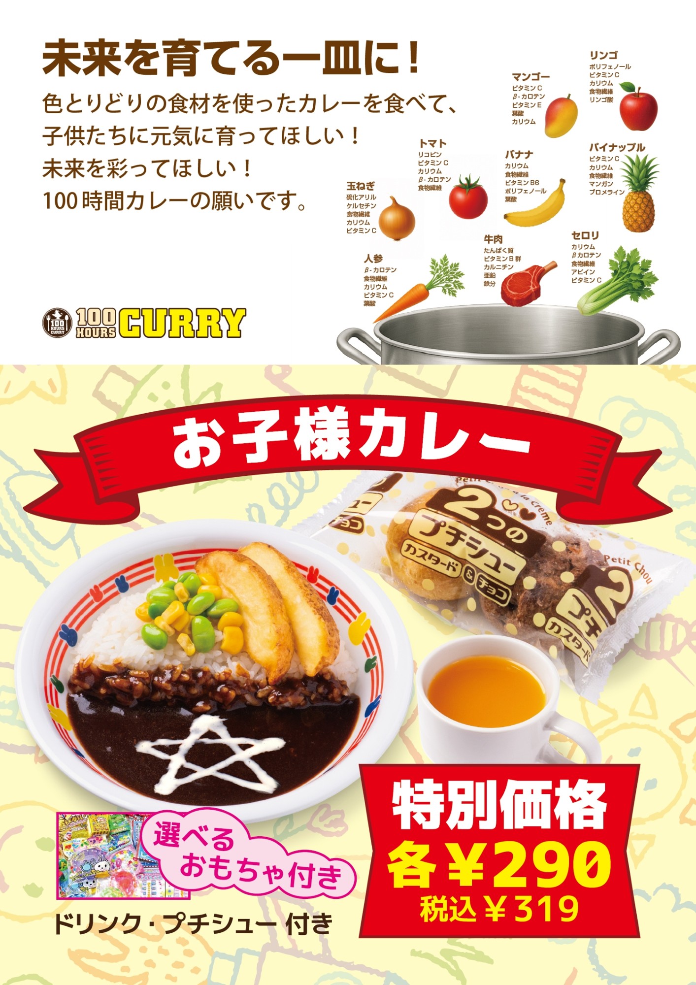 カレー、ドリンク・プチシュー・選べるおもちゃ付きです。