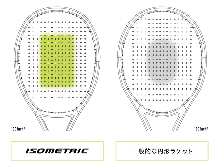 アイソメトリックとは、スウィートエリアを拡大させるヨネックス独自の形状理論。縦横のストリングの長さを均等に近づけることで、一般的な円形ラケットに比べ上下左右に7%※広いスウィートエリアを実現。