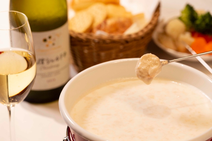 信州では「信州みそ」を中心に、大豆加工製品が各地で製造されています。そこで、地元で作られた豆乳を存分に楽しめる、冬にぴったりの温かい料理「湯葉フォンデュ」を提供しようと考えました。湯葉フォンデュは、濃厚な豆乳を加熱して湯葉を作り、麩やラスクなどの食材にからませて楽しみます。また、味付けには、味噌や昆布だれの中から好みのものを選べます。ペアリングには信州のワインがおすすめ。地元で作られた食材と地酒との相性は抜群です。