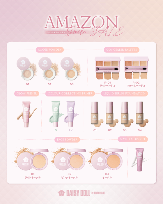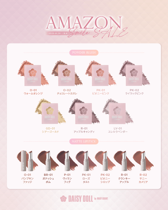 2025年9月4日(木)23:59まで、Amazon スマイルSALEでデイジードールが10%オフ!かわいいメイクアイテムをお得にゲットできるチャンス♪期間限定のスペシャルプライスをお見逃しなく!
