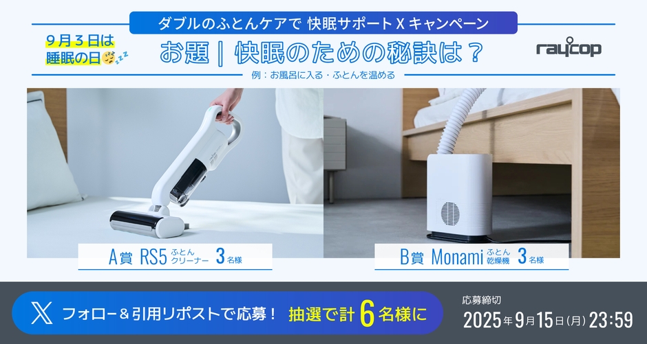 レイコップ株式会社(本社:東京都千代田区 CEO:マイケル・リー)では、9月3日の「睡眠の日」にちなみ、睡眠環境をサポートする〔ふとんクリーナー|RS5〕と〔ふとん乾燥機|モナミ〕の【“W(ダブル)”のふとんケアで、ぐっすり快眠サポート!キャンペーン】を、SNS(X)公式アカウントにて、2025年9月3日(水)~2025年9月15日(月)実施いたします。