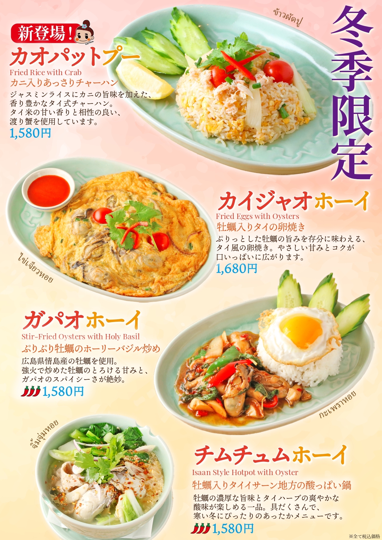 本格タイ料理で味わう、旬の海鮮!SUU・SUU・CHAIYOOにて 新登場カニの新作チャーハンと牡蠣の季節限定3種の販売を開始