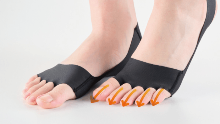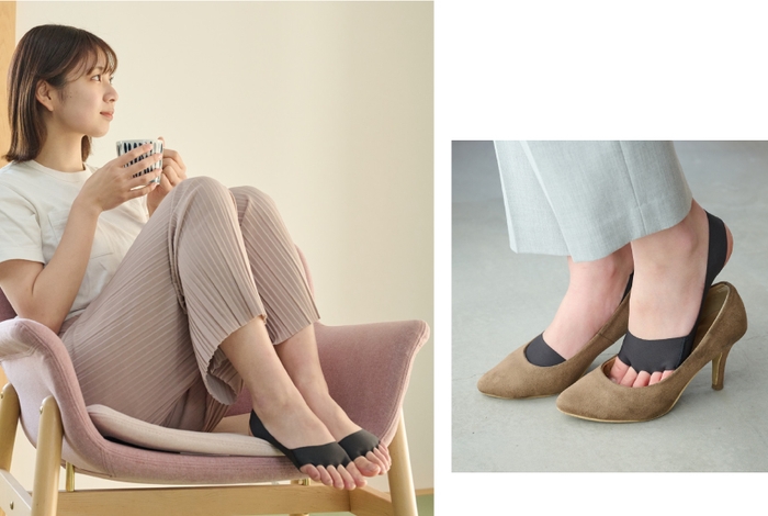 指を通し、かかとにベルトをかける構造で、縦アーチを整え、足底の負担を軽減します。