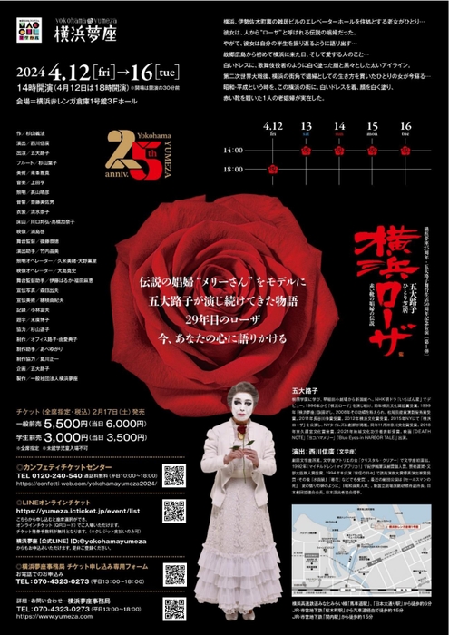 一般社団法人横浜夢座(代表:五大路子)主催、『五大路子ひとり芝居「横浜ローザ」赤い靴の娼婦の伝説』が2024年4月12日 (金) ~2024年4月16日 (火)に横浜赤レンガ倉庫1号館3Fホール(神奈川県横浜市中区新港一丁目1番1号)にて上演されます。