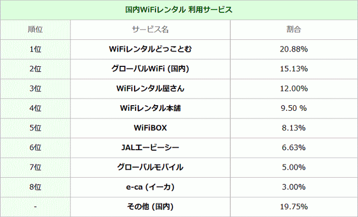 国内Wi-Fiレンタルサービスを利用された方でトップはWiFiレンタルどっとこむが20.88%、次いでグローバルWiFi・国内用が15.13%、WiFiレンタル屋さんの12%となりました。
