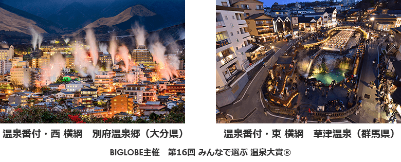 温泉地部門では草津が16年連続、別府が9年連続で東西の横綱に BIGLOBE主催「第16回 みんなで選ぶ 温泉大賞(R)」結果発表 ~旅館・ホテル部門の東西横綱は 「神戸みなと温泉 蓮」と「鬼怒川温泉 あさや」に決定