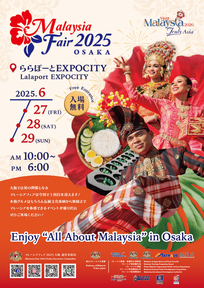 6月27日(金)~29日(日)に、大阪のららぽーとEXPOCITYにて「マレーシアフェア2025大阪」を開催いたします。昨年、大盛況のうちに終わったマレーシアフェア2024東京に引き続き、今年は初の大阪での開催となります。