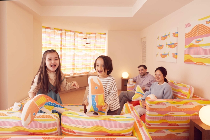 当プランで宿泊できるのは、鮭の切り身や鮭の姿がデザインされたカーテンやクッション、マグカップなどを設えた鮭ルームです。ベッドルームは、川を泳ぐ鮭を表現した空間で、ベッドフレームには、川で鮭を狙う親子のクマが描かれています。鮭の顔がデザインされたナイトキャップと、パジャマを着ると、ファミリーで鮭になった気分を味わえます。