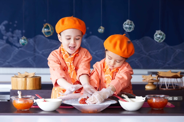 鮭の切り身をイメージしたタイとサロンを巻き、コックコート姿に着替え、いくら作りを体験します。下処理された鮭から筋子を取り出し、ぬるま湯でほぐしたら、いくらの完成です。いくらを自分で仕込むプロセスを体験できます。鮭の身は食べやすい大きさに切り、ほぐしたいくらを醤油ダレに漬けこんだら仕込みは完了です。自分で仕込んだ食材を翌日の朝食にて食べることができます。