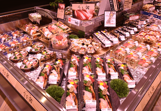 ライフで人気の魚屋の「うを鮨」コーナーを設置。新鮮の生ねたを使用しており、赤酢シャリを使用した商品なども展開しています。