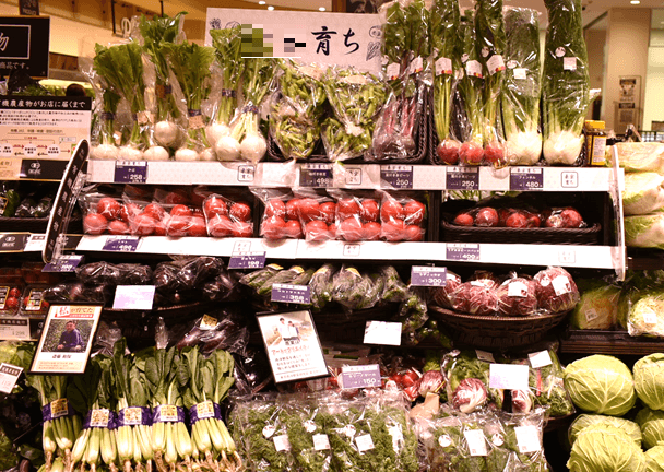所沢や川越など周辺の地元野菜を並べた「埼玉育ち」コーナーを設置。色とりどりの新鮮野菜を豊富に品ぞろえいたします。
