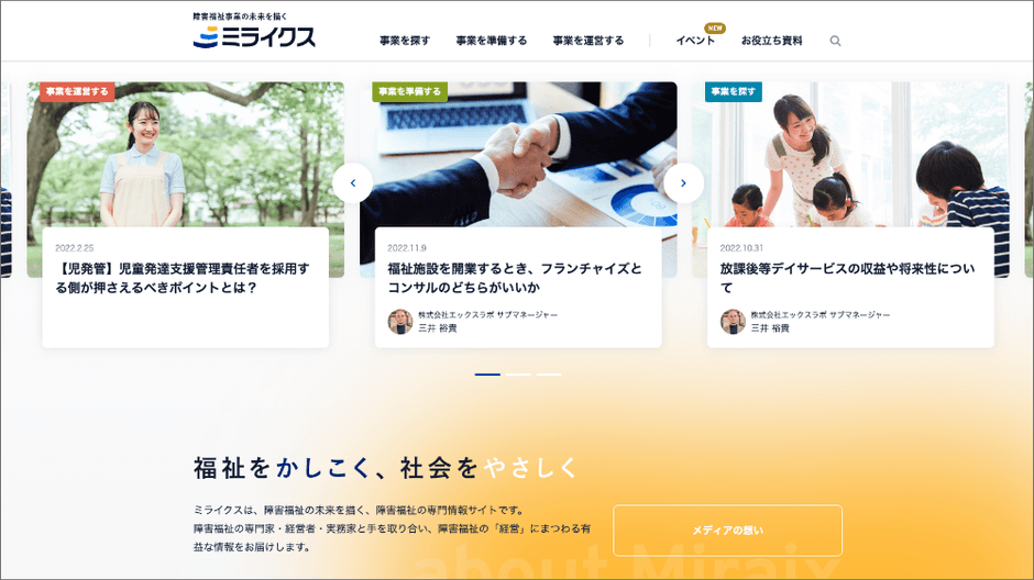 障害福祉サービスの開業支援を行う株式会社エックスラボ(所在地:大阪府大阪市北区、代表:藤 勝行)は、障害福祉の専門家・経営者・実務家と手を取り合い、障害福祉の「経営」にまつわる有益な情報をお届けするWEBサイト「ミライクス」を2023年3月1日(水)に開設しました。