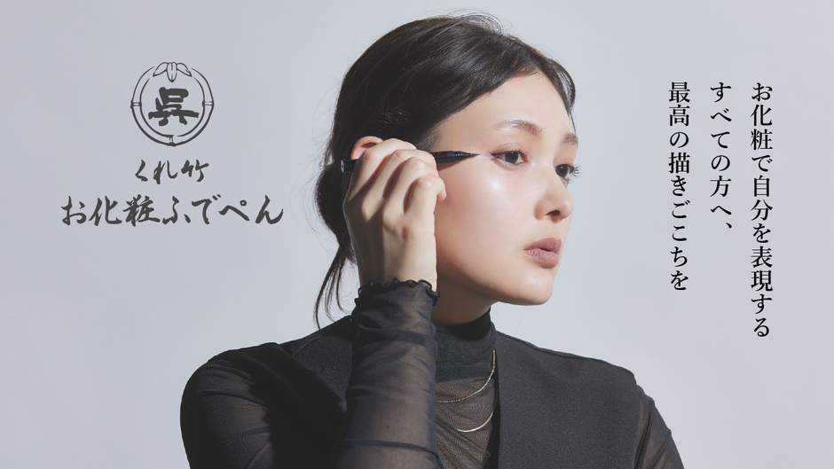 「くれ竹 お化粧ふでぺん」は、創業120年を超える呉竹が届ける、筆ぺんの技術を活かしたコスメブランドです。長年、書道用品や筆ぺん製造を通じて育んだ技術を結集させ、リキッドアイライナー、リキッドアイブロウを開発しました。