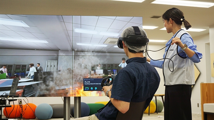 VRキット「火災臨場体験VR 混乱のオフィス」を使用した訓練。オフィスビルでの火災や大地震の恐怖と、それを目の当たりにした人々の混乱の様子を、プレイヤー自身もその空間内にいるひとりとして、リアルに体験できる。