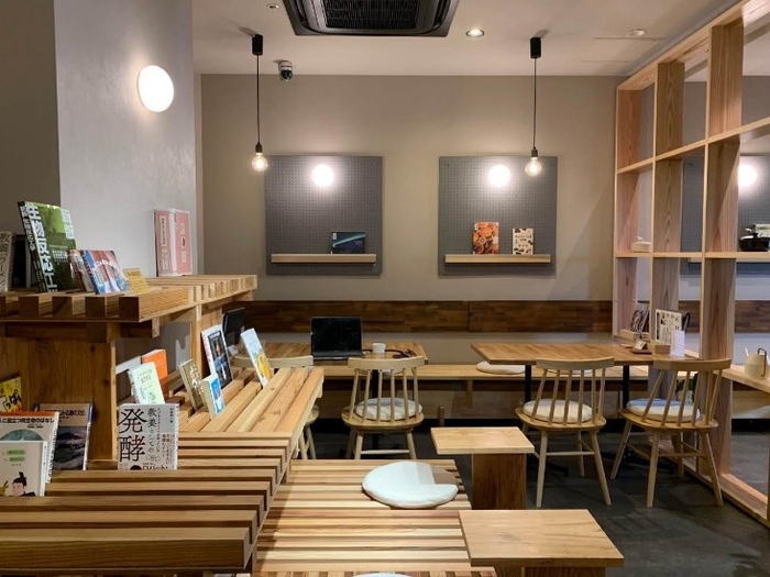 ・置かれている書籍は鶴舞中央図書館の協力で、50冊程度が並び、その選書は本学学生グループ「サカバンブックス」が担当。書籍は定期的に入れ替えられ、食やお酒に関する本のほか、同店舗が発酵食材にも力を入れているため、発酵に関する書籍も設置。