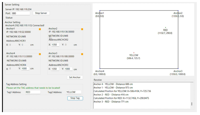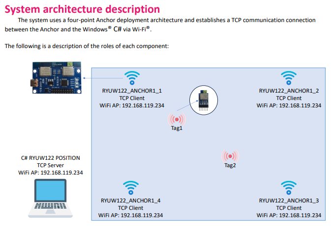 ・通信プロトコル: アンカーとWindows上のGUIアプリケーション(TCPサーバー)間は、Wi-Fiを介したTCP通信によって接続されます。複数のアンカーデバイスで測定した距離データをWi-Fi経由でホストPCへ転送することでGUIアプリケーション上でタグの位置を算出することができます。