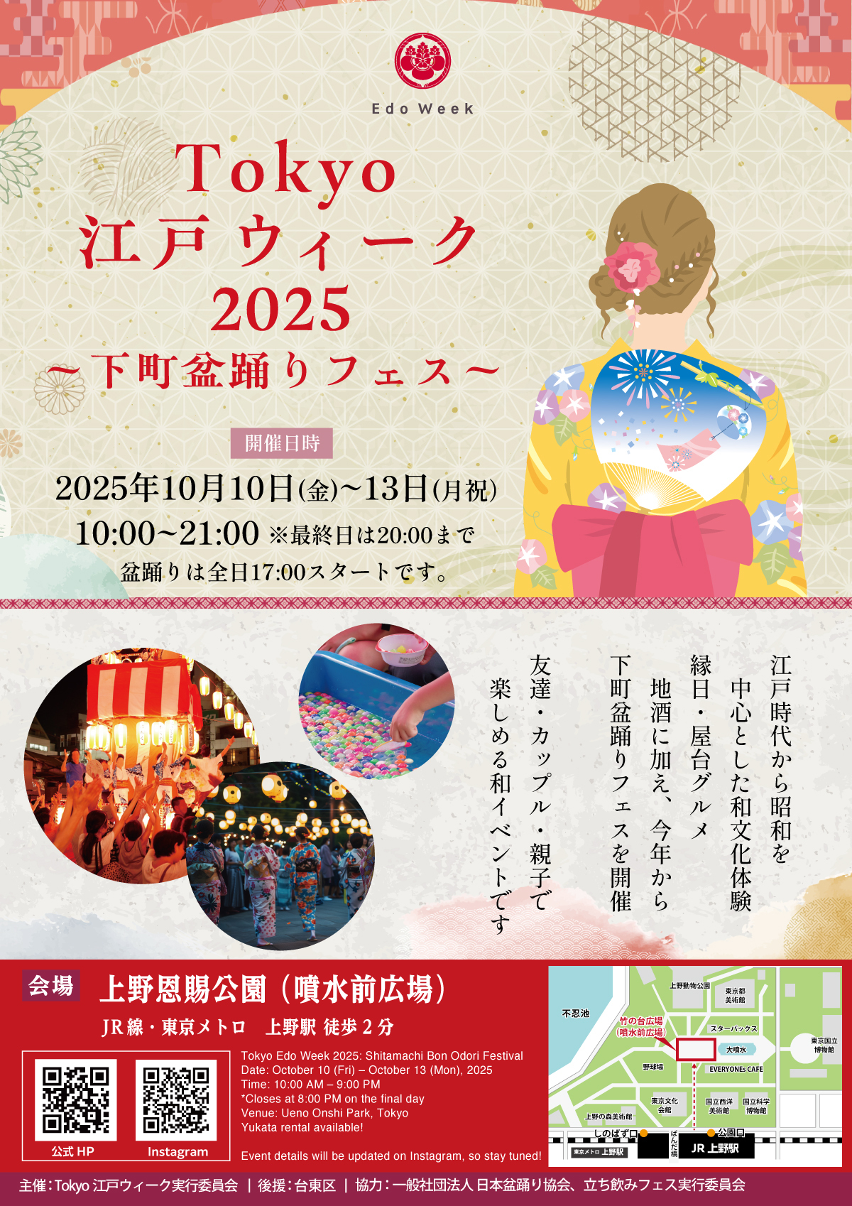Tokyo江戸ウィーク実行委員会は、従来までの「Tokyo江戸ウィーク」を更にパワーアップし、2025年10月10日(金)~13日(月祝)の4日間、東京・上野恩賜公園 竹の台広場(噴水前広場)にて、『Tokyo江戸ウィーク2025~下町盆踊りフェス~』を開催することをお知らせいたします。