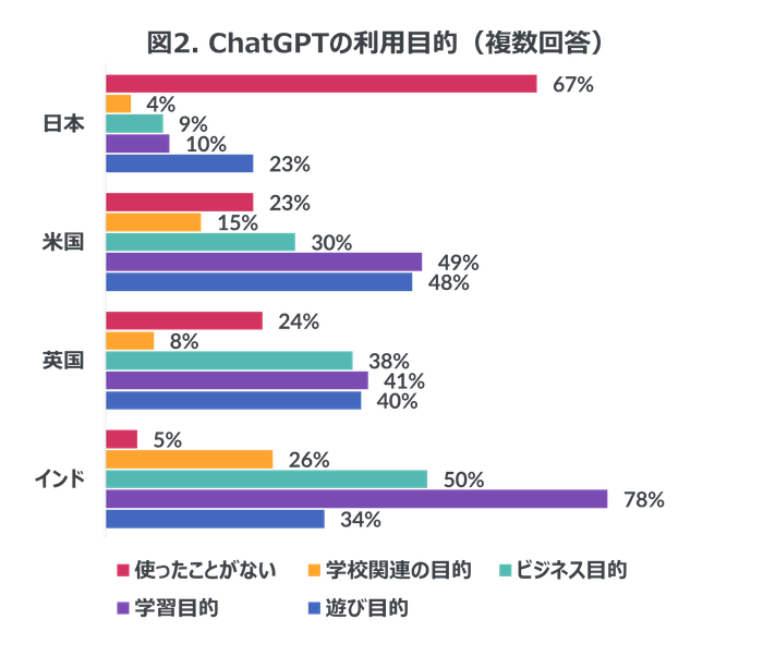 日本の回答者の内、回答率が最も高かった利用目的は「遊び目的」で23%、次いで「学習目的」で10%だった。この2つの目的は、他3か国の結果でも多く挙げられており、インド人の「学習目的」での利用は78%と群を抜いて高い。