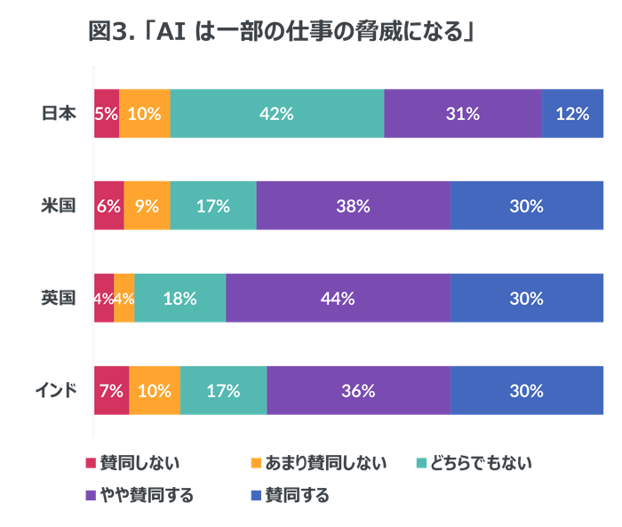 別の調査設問をみると、「AIは自分の仕事に影響を与えない」というステートメントに対して、日本人で賛同した回答者は11%だった。これはインド25%、米国19%、英国13%より低かった。
