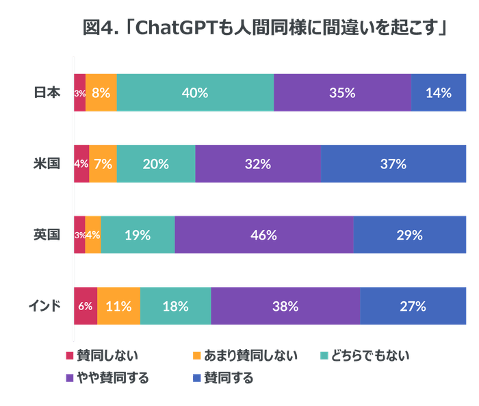 米国、英国そしてインドでは30%近くがChatGPTが間違えることに賛同した。一方、日本では「賛同する」がわずか14%にとどまっている。仕事の脅威や影響と同じく、ChatGPTの回答精度に対しての認識も他国と差がある状態だ。