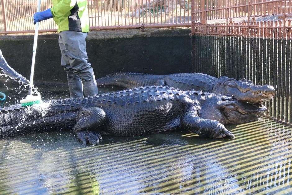 園内の大掃除の一環として始まり、いつもの掃除に比べ、より丁寧に、池の苔や汚れを落とすと同時に、ワニの背中の汚れも落とし、新年を迎える準備をいたします。