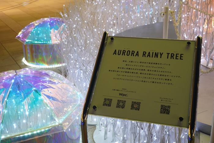 今年6月に販売開始すると、SNSで話題になり即完売となったWpc.™のオーロラビニール傘が大阪の冬の夜を彩ります。様々な角度からキラキラと美しく光り、見るたびに表情が変わる様子をぜひお楽しみください。