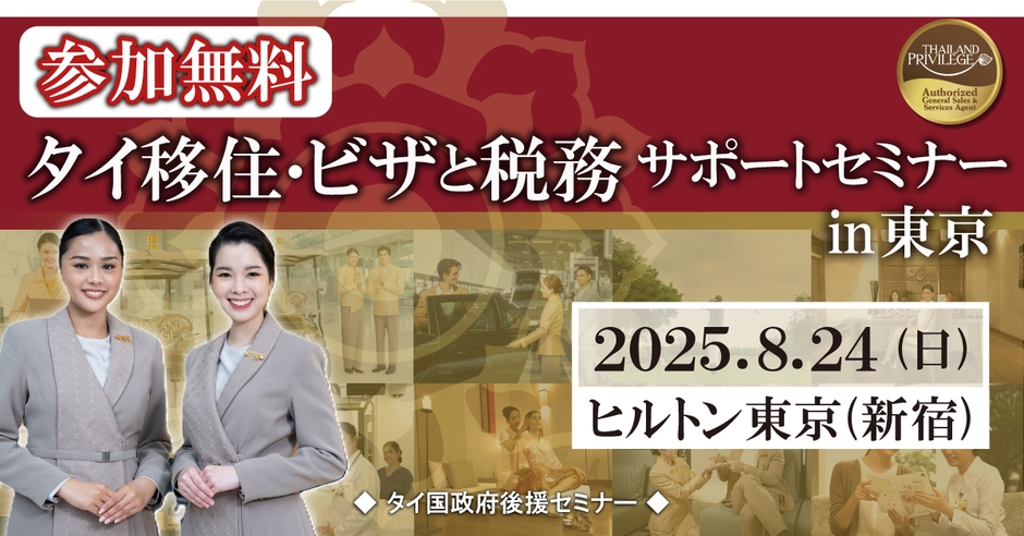 タイランドエリートインフォメーションセンター(運営:株式会社大丸トレーディング)は、タイ長期滞在プログラム「タイランドプリビレッジ」による公式無料セミナー【タイ移住・ビザと税務サポートセミナーin東京】を、ヒルトン東京(新宿)で2025年8月24日(日)に開催いたします。