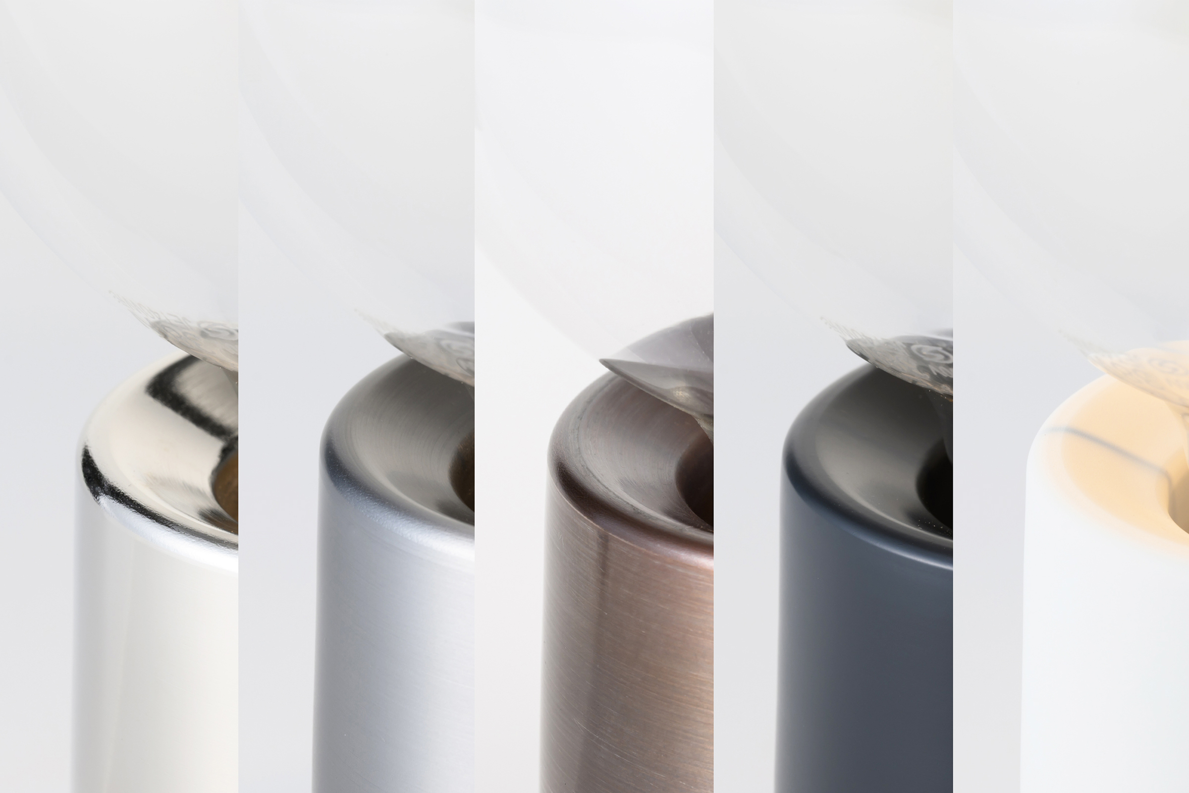廊下、玄関、サニタリールームといった住まいの小スペースから、ホテルの客室や飲食店のカウンターまで。「BULB LIGHT CAP」は、「照らす」ための道具ではなく、「点けても消しても美しい」存在であることを追求しました。従来の3色(ゴールド/シルバー/ブロンズ)に、炎による酸化現象をデザインに昇華させたオリジナル色「ABURI」など新5色を加え、全8色のカラーバリエーションへと進化いたしました。